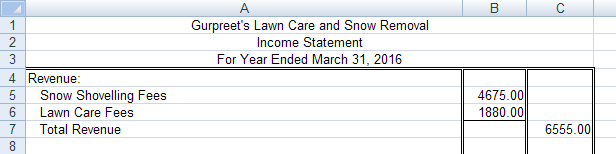 Important Note: The amount of the net income shown on the income statement should agree with the amount of the net income recorded on the worksheet. To see an example, view Gurpreet’s Net Income Section on Income Statement.